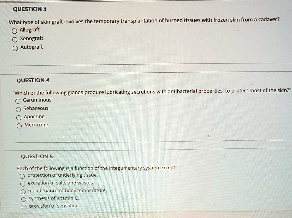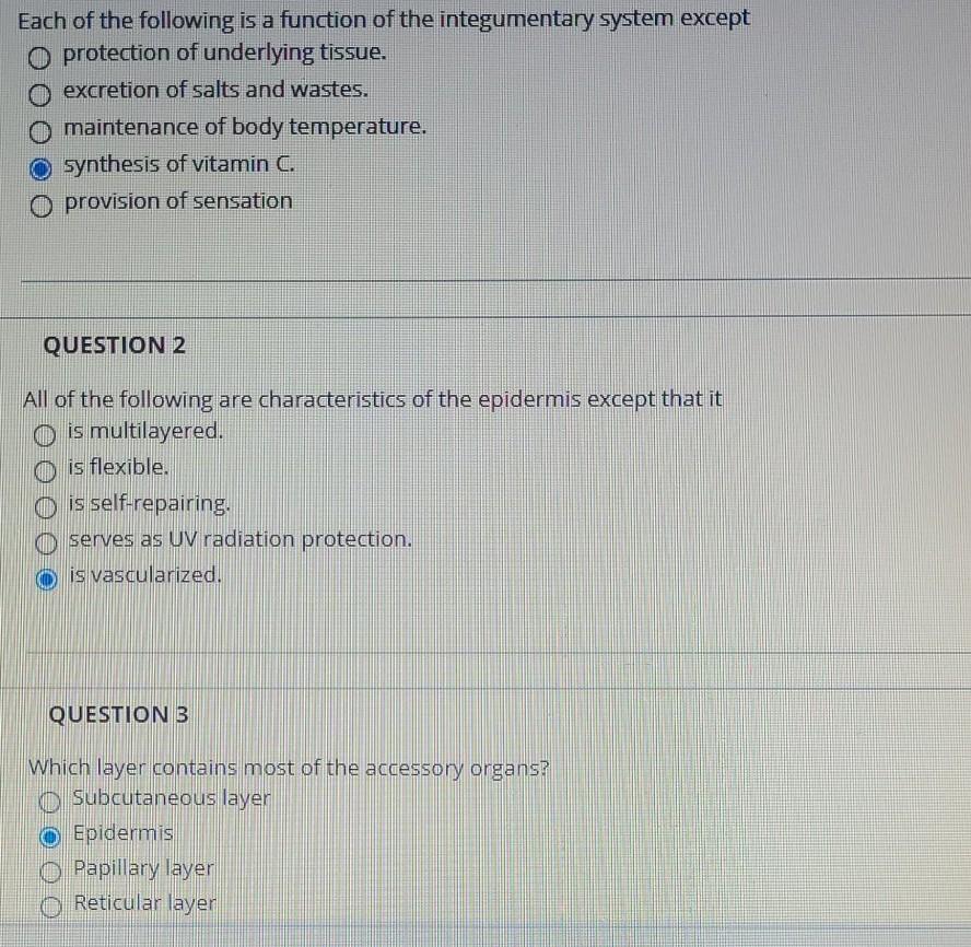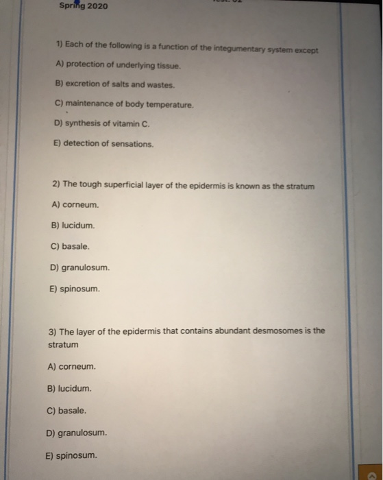 E provision of sensation. Excretion of salts and wastes. D synthesis of vitamin C. Maintenance of body temperature. Synthesis of vitamin c. The sympathetic nervous system is continuously monitoring body temperature and initiating appropriate motor responses. Basale spinosum granulosum lucidum corneaum. E provision of sensation. Question 40 Selected Answer Answers Each of the following is a function of the from BIOLOGY 143 at Kansas City Kansas Community College.