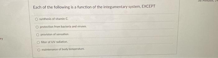 Each of the following is a function of the integumentary system except. 1 Each of the following is a function of the integumentary system except A protection of underlying tissue. Excretion of salts and wastes. D synthesis of vitamin C.