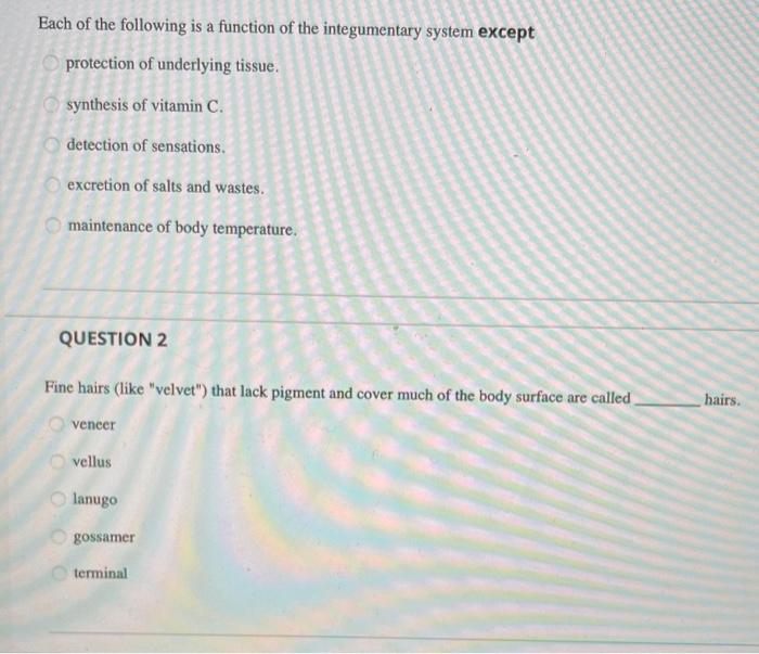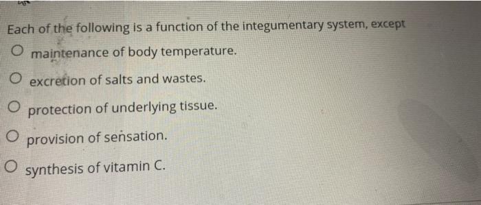 Each of the following is a function of the integumentary system except. B excretion of salts and wastes. Each of the following is a function of the integumentary system except a.