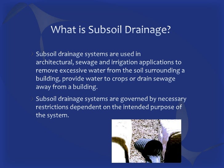 Sub soil drainage system. Subsoil drainage effectively pegs the watertable and stabilises the soil. A subsurface drainage system is a system for the removal of excess water and salts from the soil using the groundwater as a vehicle. However the system can be installed as a retrofit by performing the selective demolition of areas of the slab.